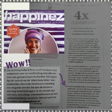 Met naam in de Happinez! “Elegant van vorm en krachtig van boodschap” een compliment om trots op te zijn. Het amulet voor de Stichting Ruby and Rose is inmiddels door zo veel personen gekocht dat het met recht een succes kan worden genoemd. Het amulet is te bestellen op www.rubyandrose.nl