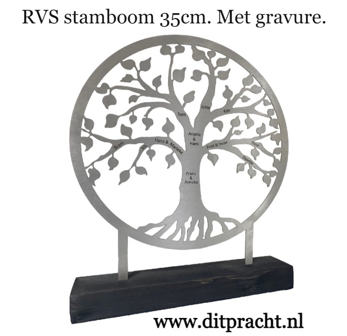 - Een RVS stamboom gegraveerd in een houten sokkel – voor een blijvende herinnering aan familie.