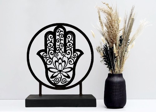 Prachtige staal gecoate Hamsa hand ofwel hand van Fatima in een houten voet. De voet is van massief hout en met de hand gebeitst. Een staand object dat leuk is voor o.a. het raam, op een tafel of kastjel.  Tijdens het ontwerpen van deze hand is er rekening gehouden met zowel de uitstraling als de symboliek. De vorm en krullen geven de hand een sierlijke en rijke uitstraling. De Lotusbloem in de hand staat voor opbloeien, groeien, iets moois dat voorkomt uit iets vies en lelijks. Het hart van de lotusbloem is heel subtiel een oogje. Dit oogje, de Nazar gecombineerd met de Hamsa wordt beschouwd als tegengif voor negatieve energieën.
