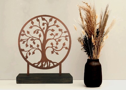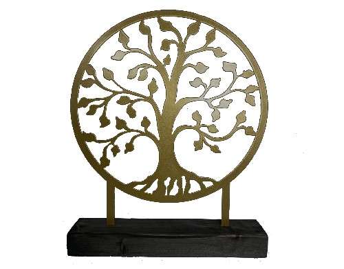 Prachtige staal gecoate staande decoratie levensboom in een houten voet. De voet is van massief hout en met de hand gebeitst. Een staand object dat leuk is voor o.a. op een tafel, kastje of op een zuil. Dit staande object is op zich al een geweldige blikvanger. De symbolische betekenis…….dat een levens boom staat voor het leven zelf, maakt dit item alleen nog mooier.