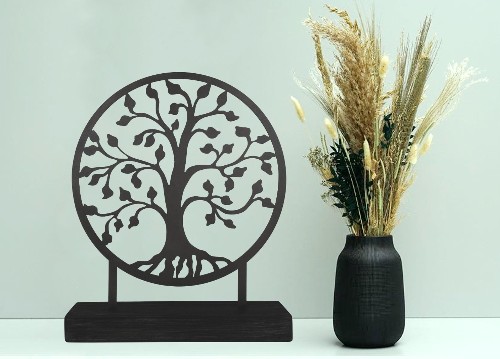 De levensboom is gemaakt van 2 mm staal. Het staal is vervolgens gepoedercoat in een RAL kleur. De voet is massief hout. Het hout is vervolgens afgewerkt in gewenste kleur. standaard kleuren zijn white wash, blank, noten en antraciet.