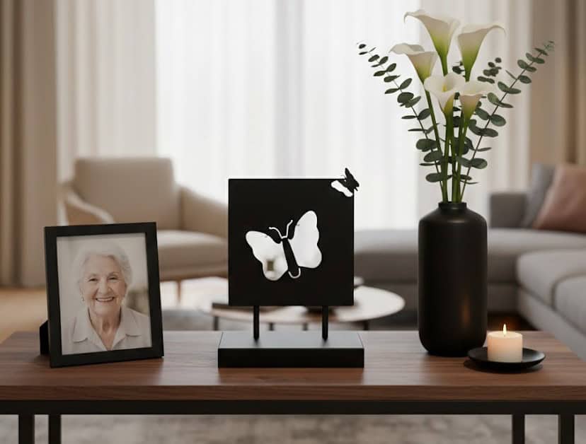 De grote vlinder heeft heel subtiel een haakje in beide vleugels. Aan deze haakjes kun je kleine objecten hangen die voor u en de overledene belangrijk zijn. De as-lade oftewel plateau sokkel is 30cm en 15cm diep. Ruimte genoeg om bijvoorbeeld een foto, vaasje of theelicht op te plaatsen. Kortom…een prachtig object om op uw eigen unieke manier te gedenken.